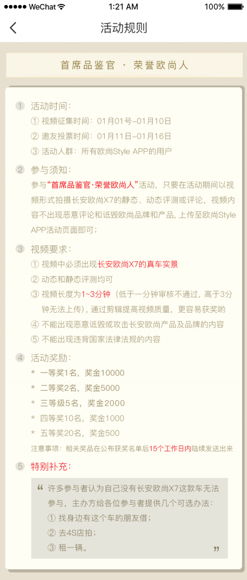 既然是大赛,那就不可避免涉及到奖项,这也是大奖最为关心的部分。长安欧尚本次拿出了超大的诚意,只要你的作品不涉及负面消息或时政,时常在1-3分钟内,并且视频内容都与长安欧尚X7相关,便有机会获得本次大赛设置的一等奖,独揽万元现金奖励。且除一等奖外,此次大赛还设置了二、三、四、五等奖,皆有极为丰厚的现金奖励。在1月10日稿件征集截止后,1月11日至16日将为公开投票时间,而最终的大奖得主也将由此产生,在许多节目活动票数造假后,这样公平公开的投票,更是显得难能可贵。